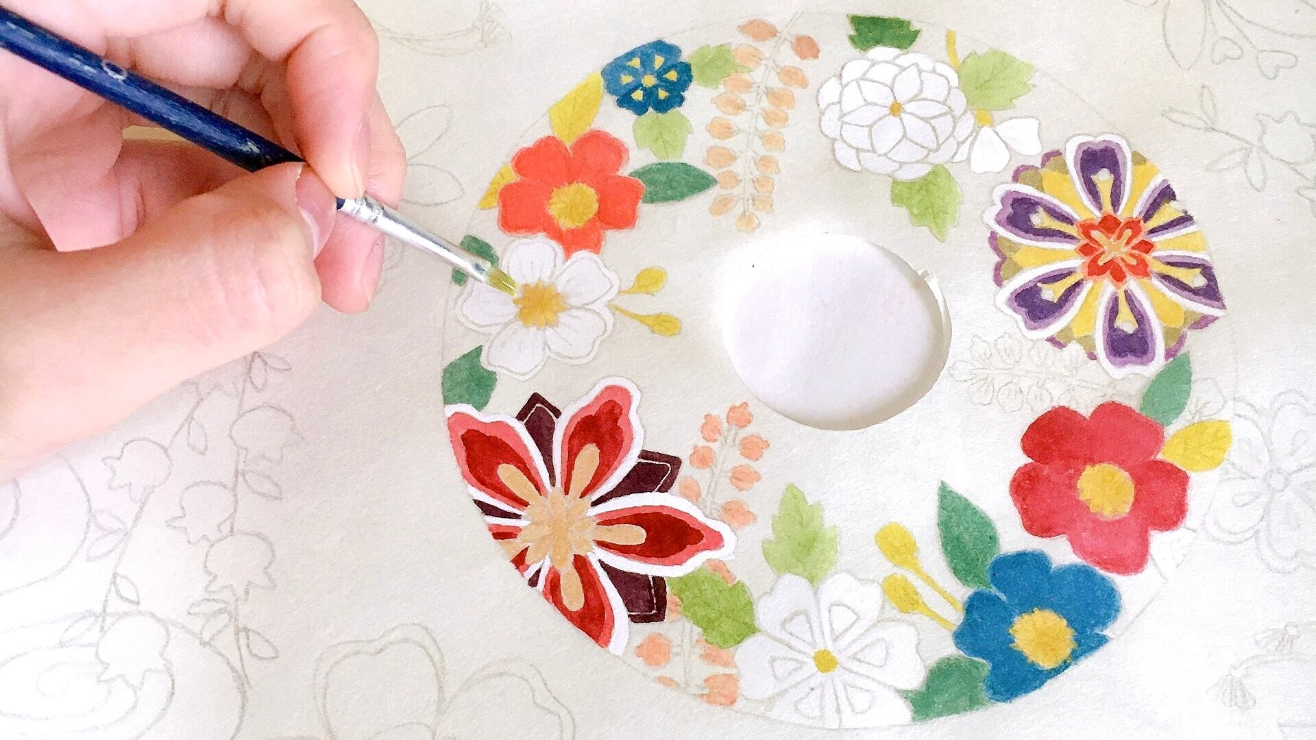 『振袖和傘』は振袖のデザインを傘に落とし込み、一本一本丁寧に絵付けしています。桜・菊・牡丹・梅など、日本の花々が漆黒の背景によく映えます。