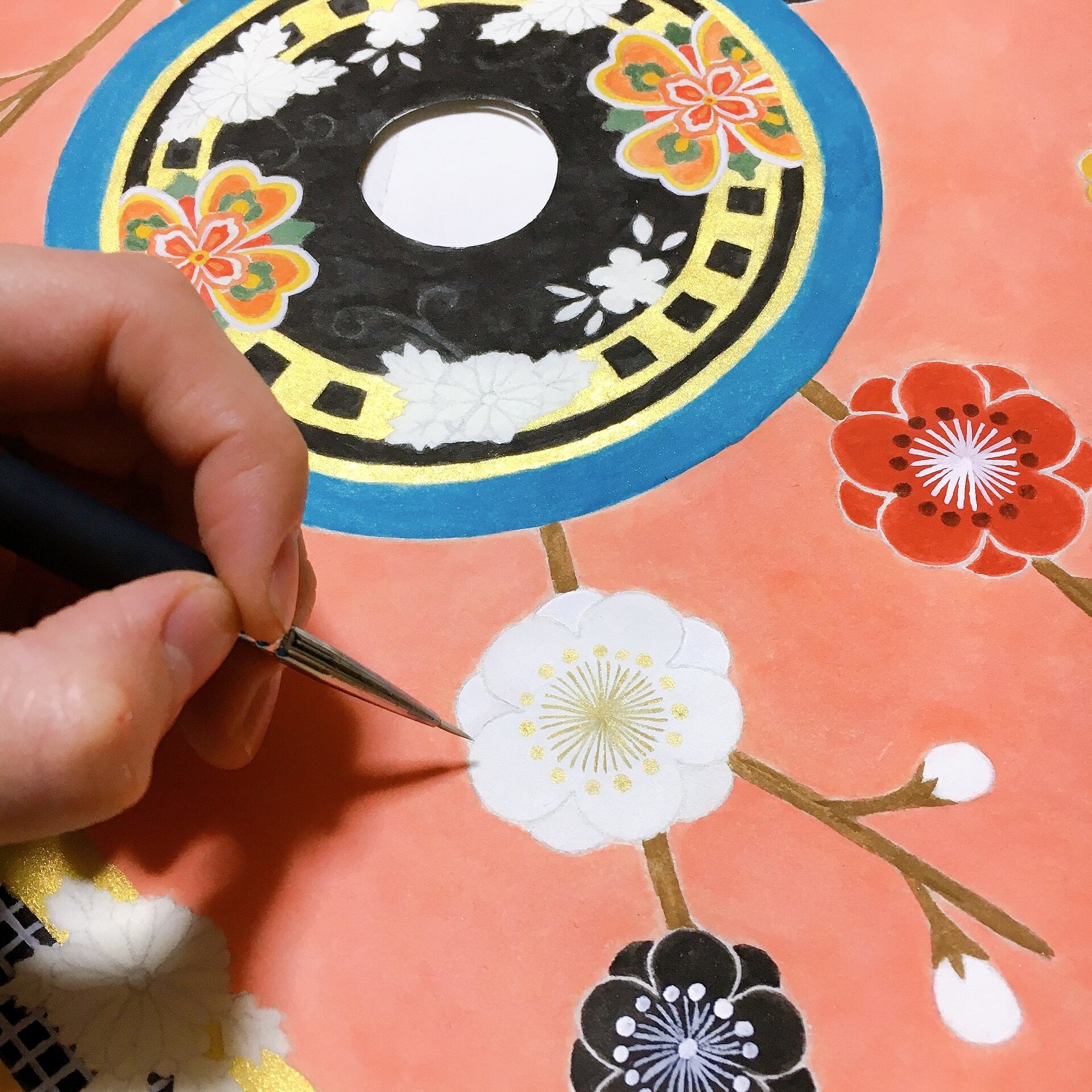 『振袖和傘』は振袖のデザインを傘に落とし込み、一本一本丁寧に絵付けしています。桜・菊・牡丹・梅など、日本の花々が漆黒の背景によく映えます。