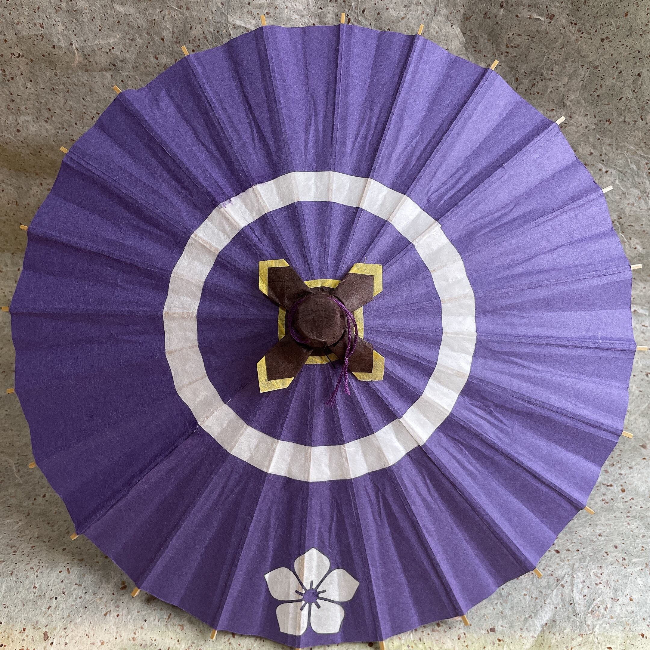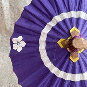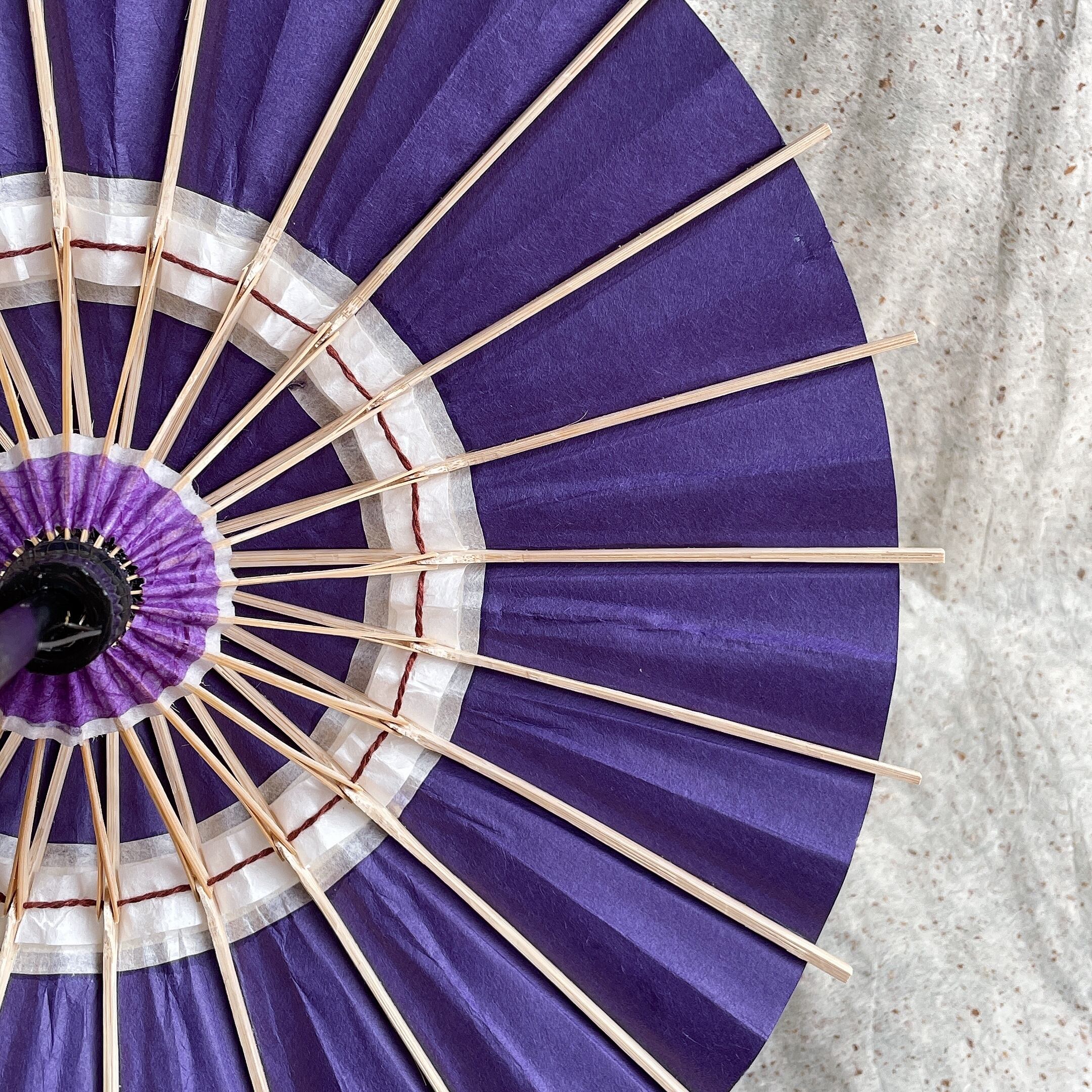 和傘の定番である蛇目に1つ紋を入れたシンプルなデザインです。日光に透かすと和紙の色味を楽しめます。