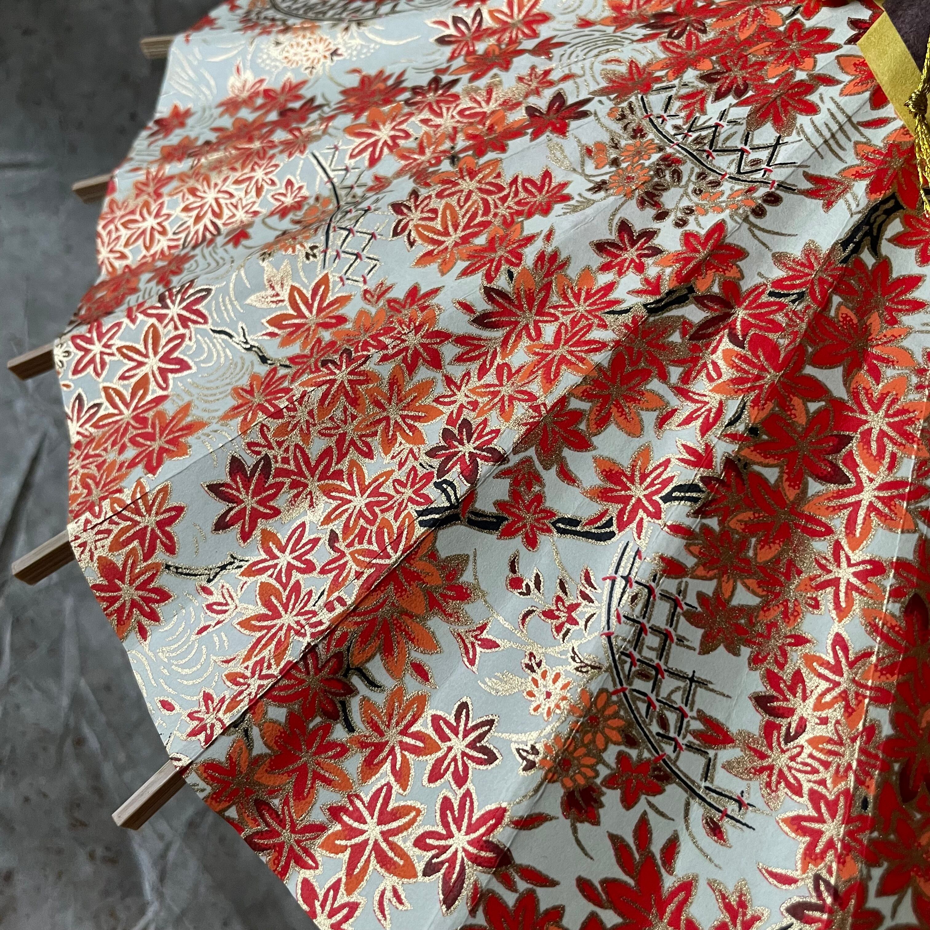 内側の「中置き紙」と呼ばれる細長い和紙を、友禅和紙の色に合わせて染めています。傘骨同士を金糸で繋いでいるので、内側も華やかです。