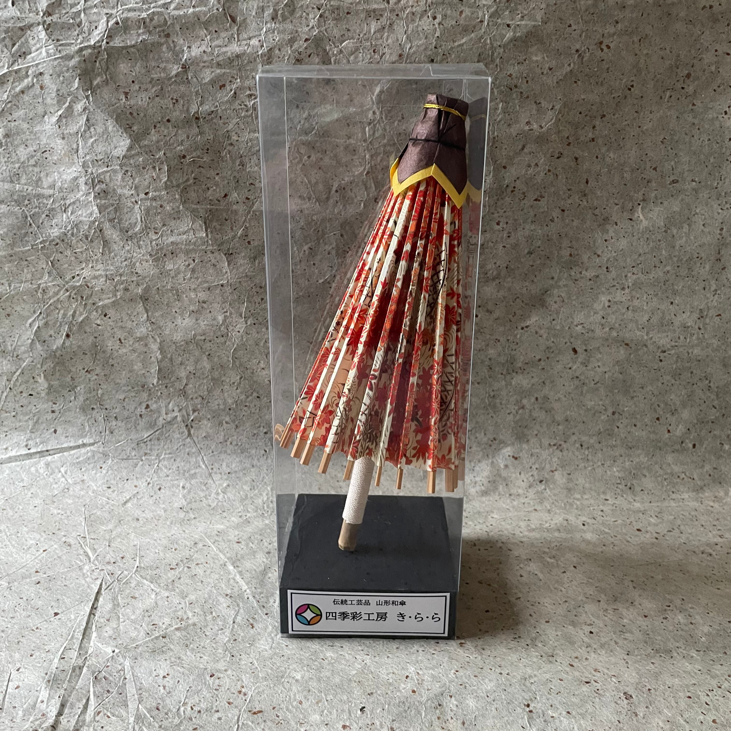 このミニ和傘は、山形県の伝統工芸品『山形和傘』の職人である古内清司氏(故)から技術を教わって作成したものです。