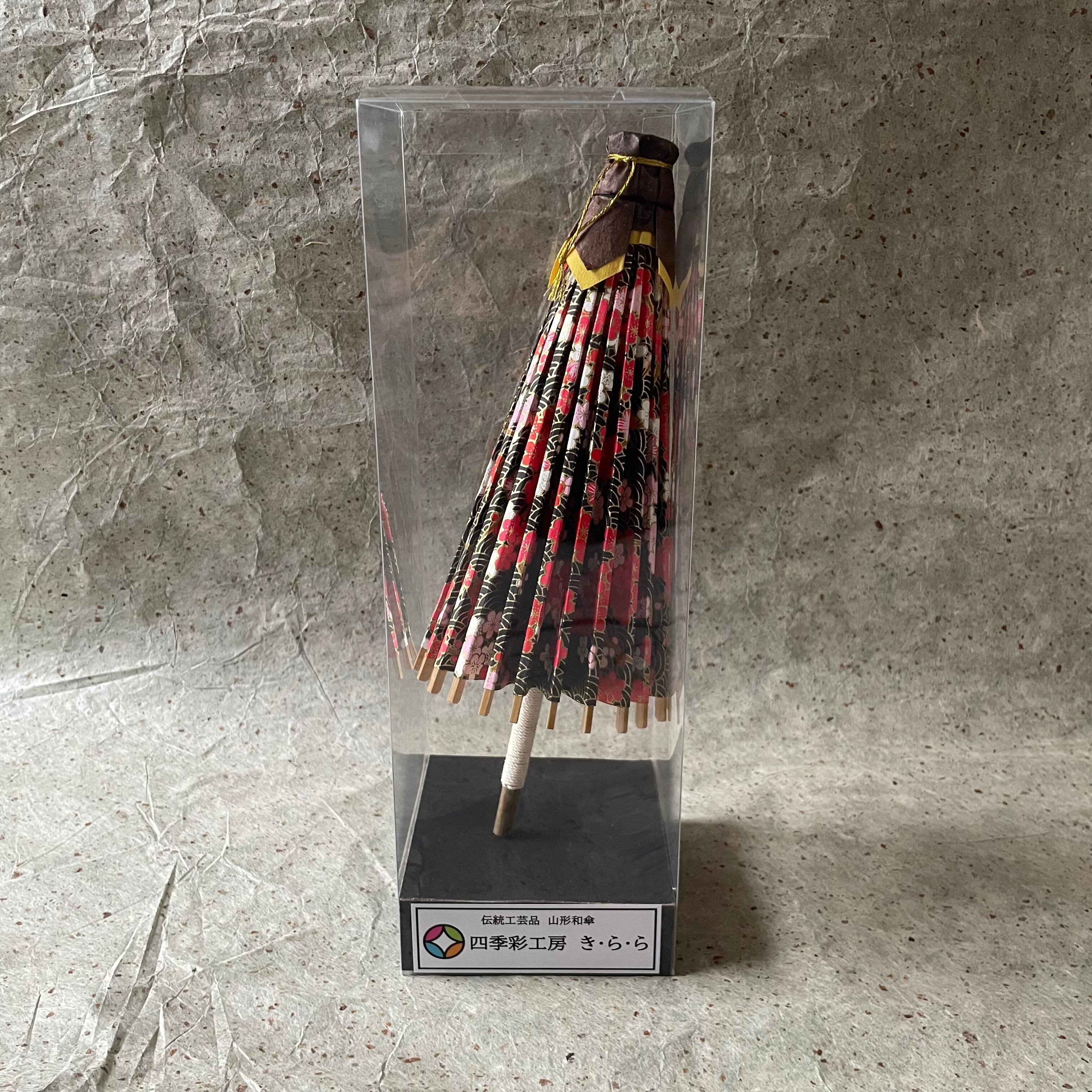 このミニ和傘は、山形県の伝統工芸品『山形和傘』の職人である古内清司氏(故)から技術を教わって作成したものです。