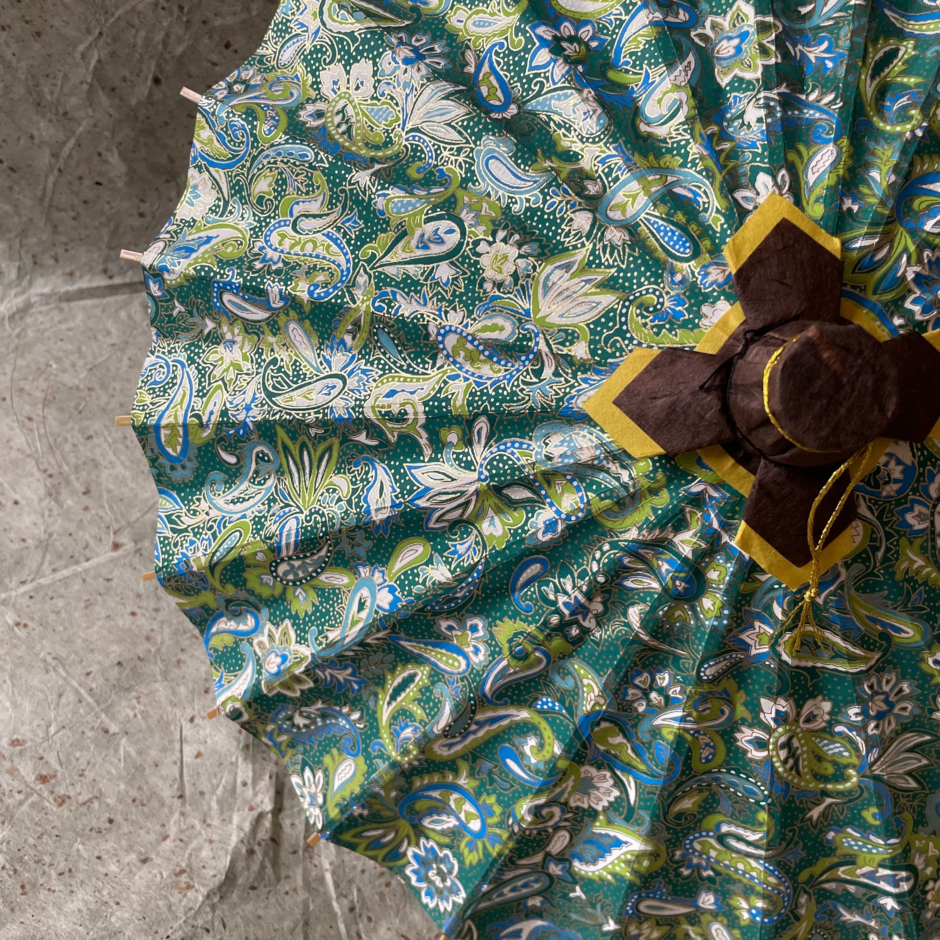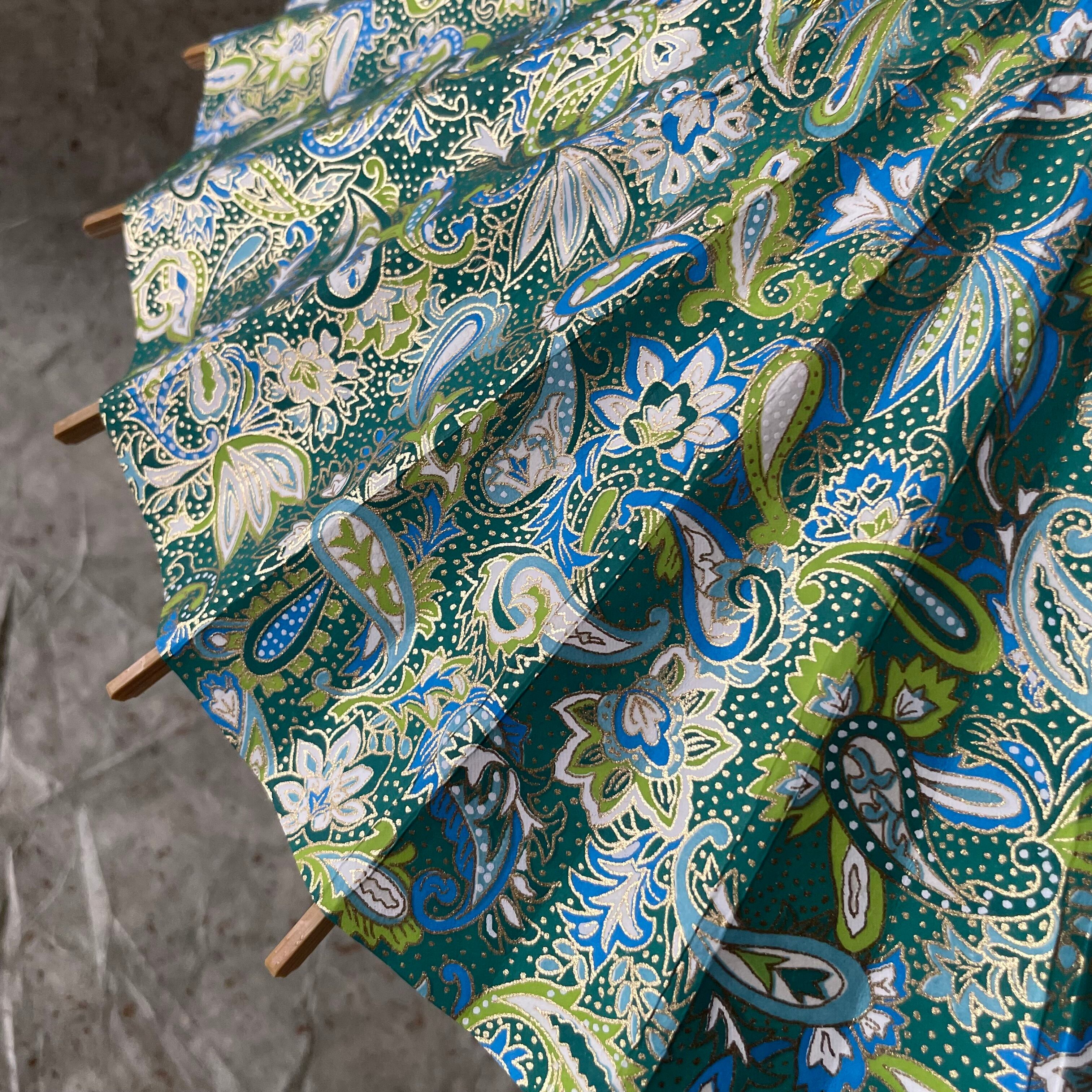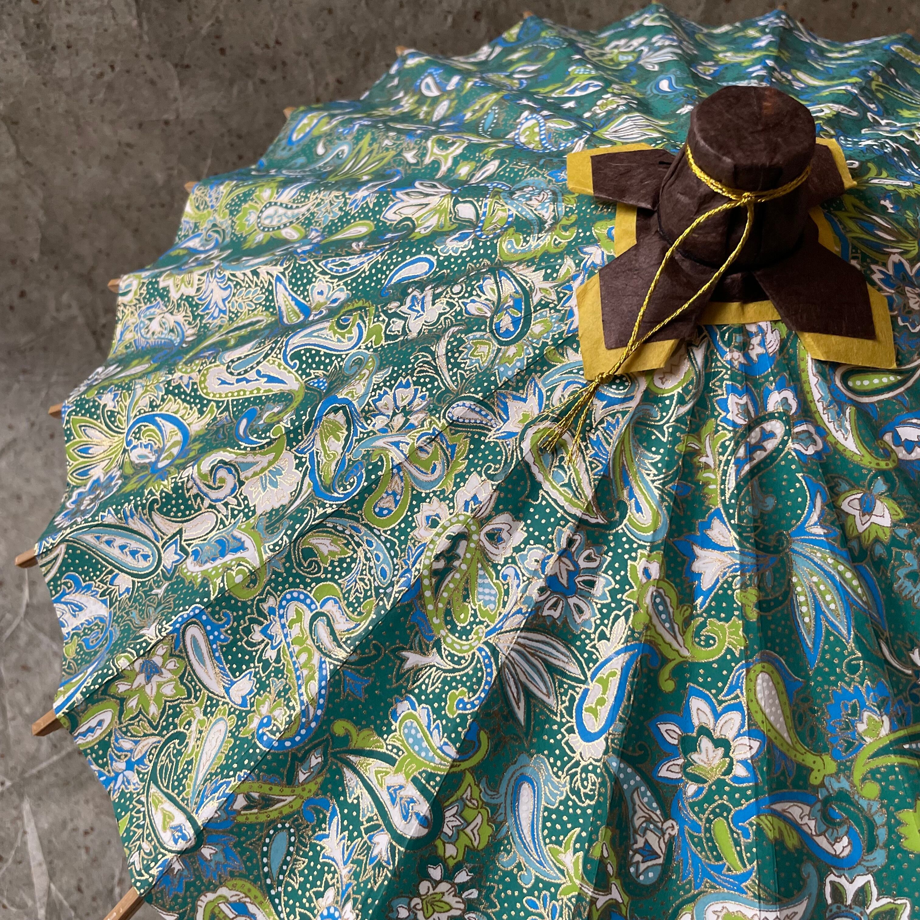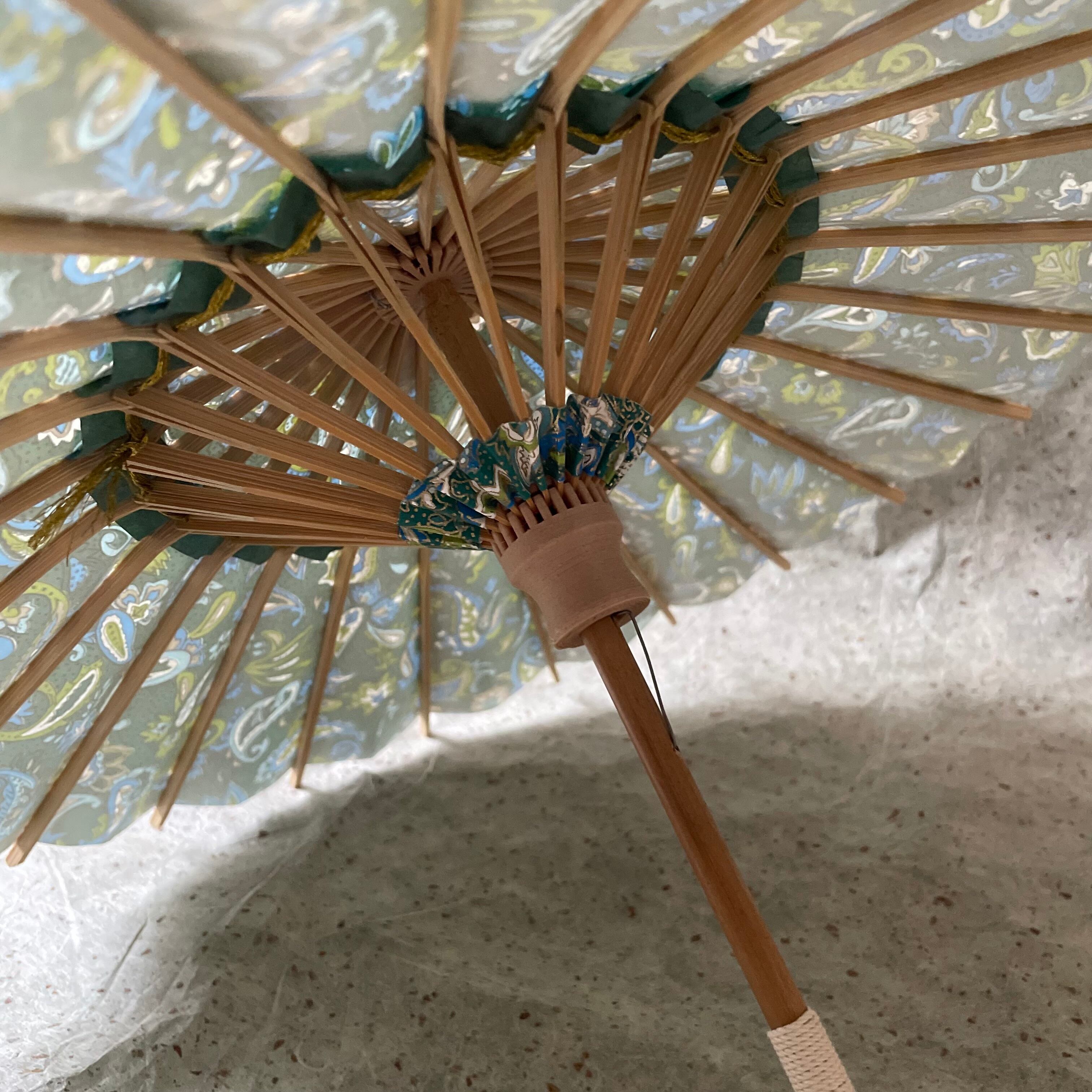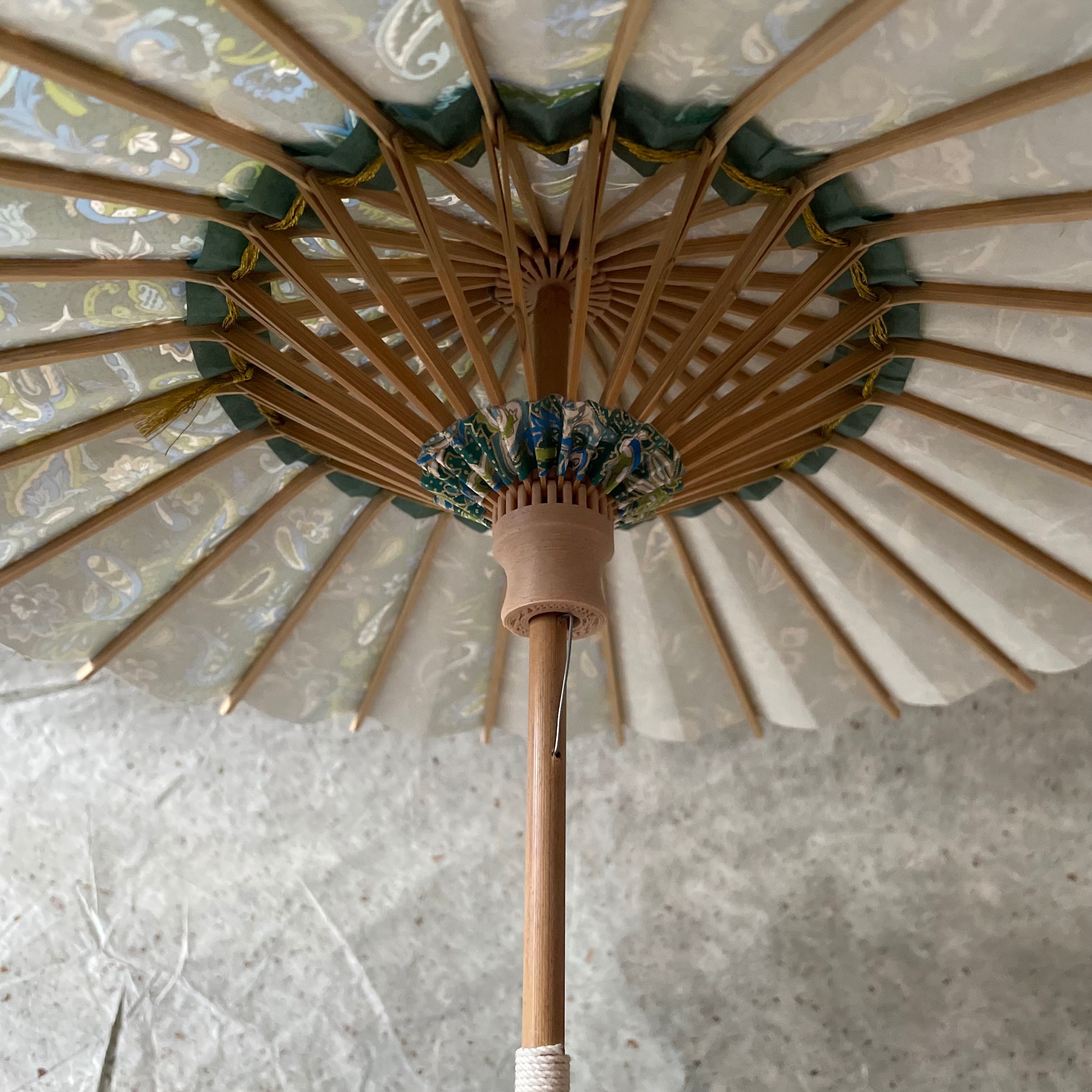 内側の「中置き紙」と呼ばれる細長い和紙を、友禅和紙の色に合わせて染めています。傘骨同士を金糸で繋いでいるので、内側も華やかです。