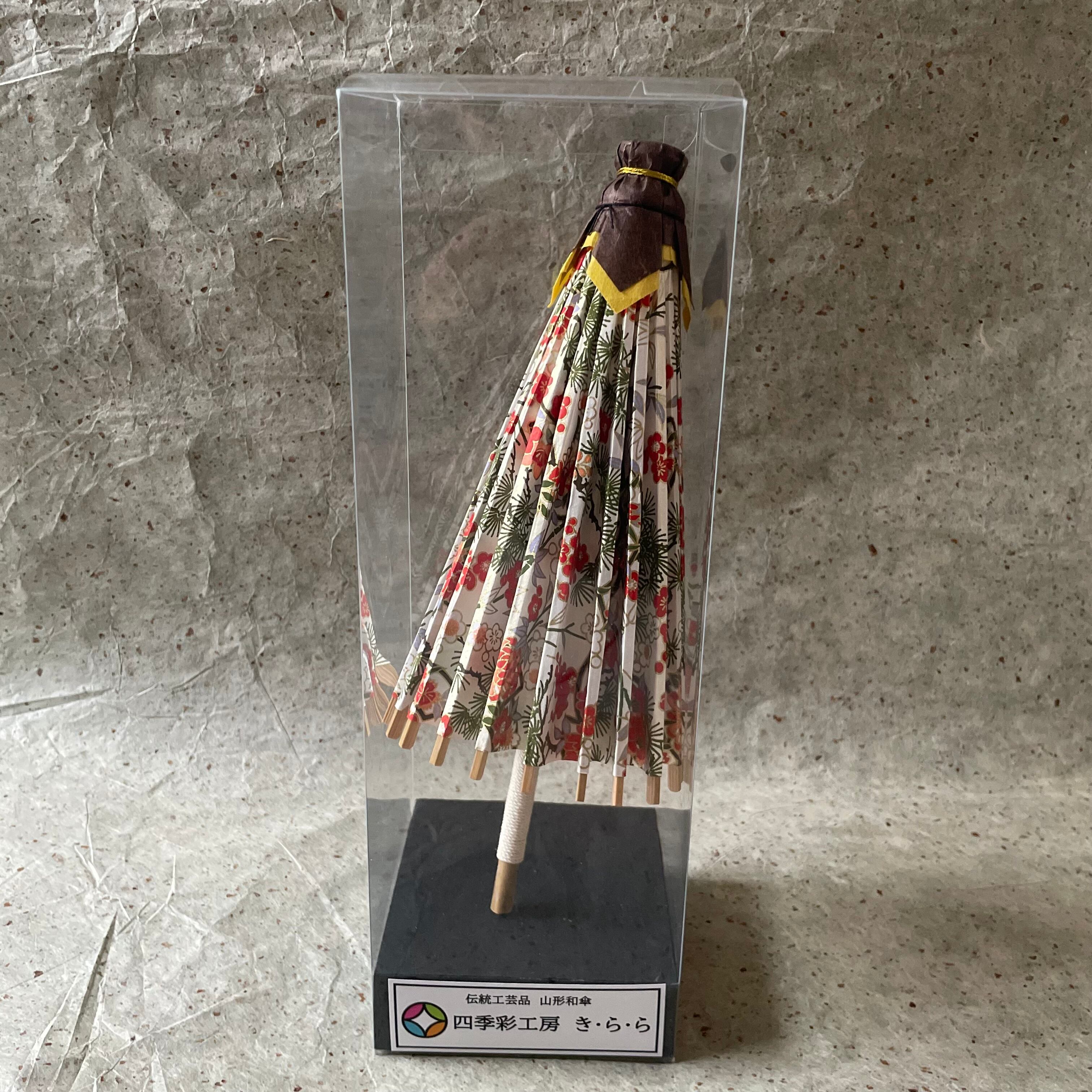 このミニ和傘は、山形県の伝統工芸品『山形和傘』の職人である古内清司氏(故)から技術を教わって作成したものです。