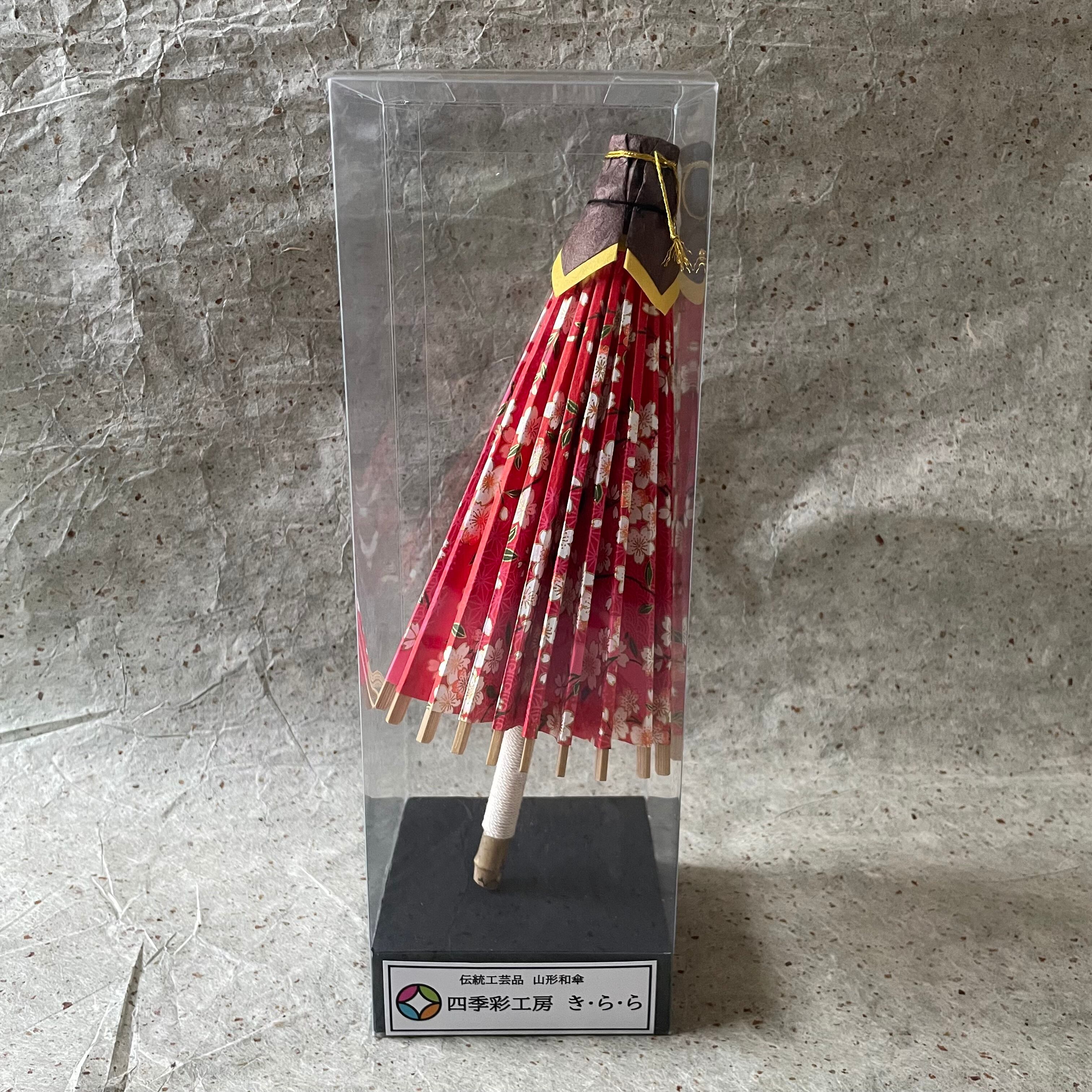 このミニ和傘は、山形県の伝統工芸品『山形和傘』の職人である古内清司氏(故)から技術を教わって作成したものです。