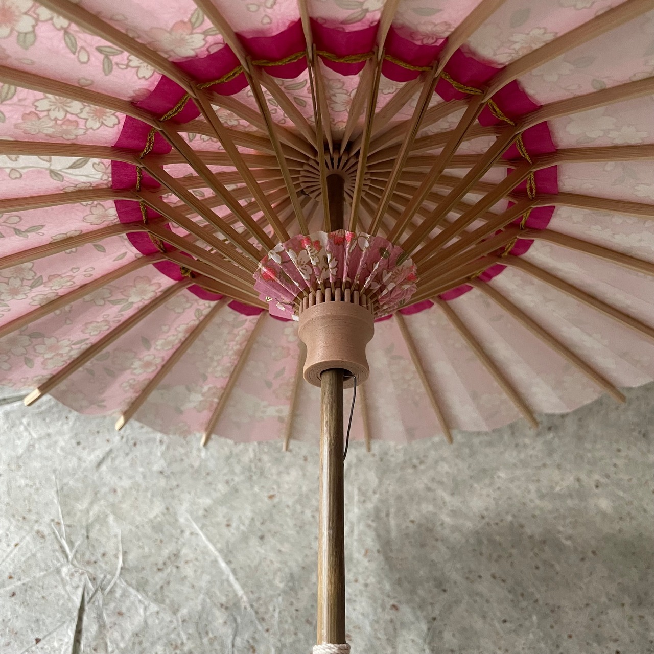 内側の「中置き紙」と呼ばれる細長い和紙を、友禅和紙の色に合わせて染めています。傘骨同士を金糸で繋いでいるので、内側も華やかです。