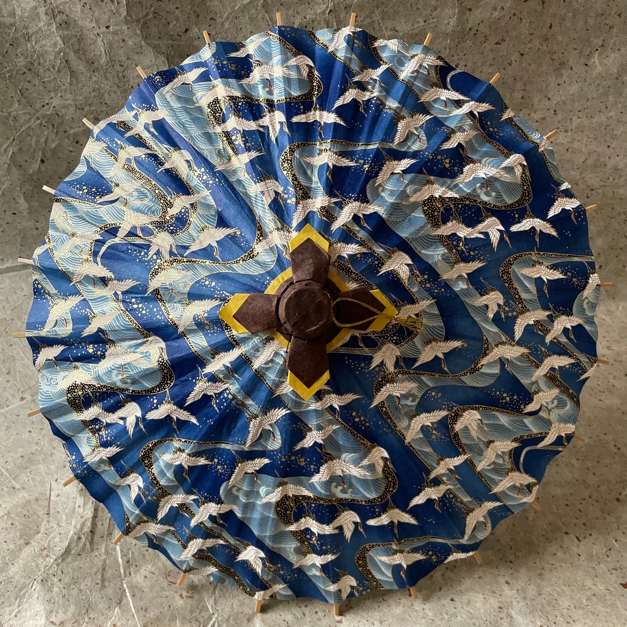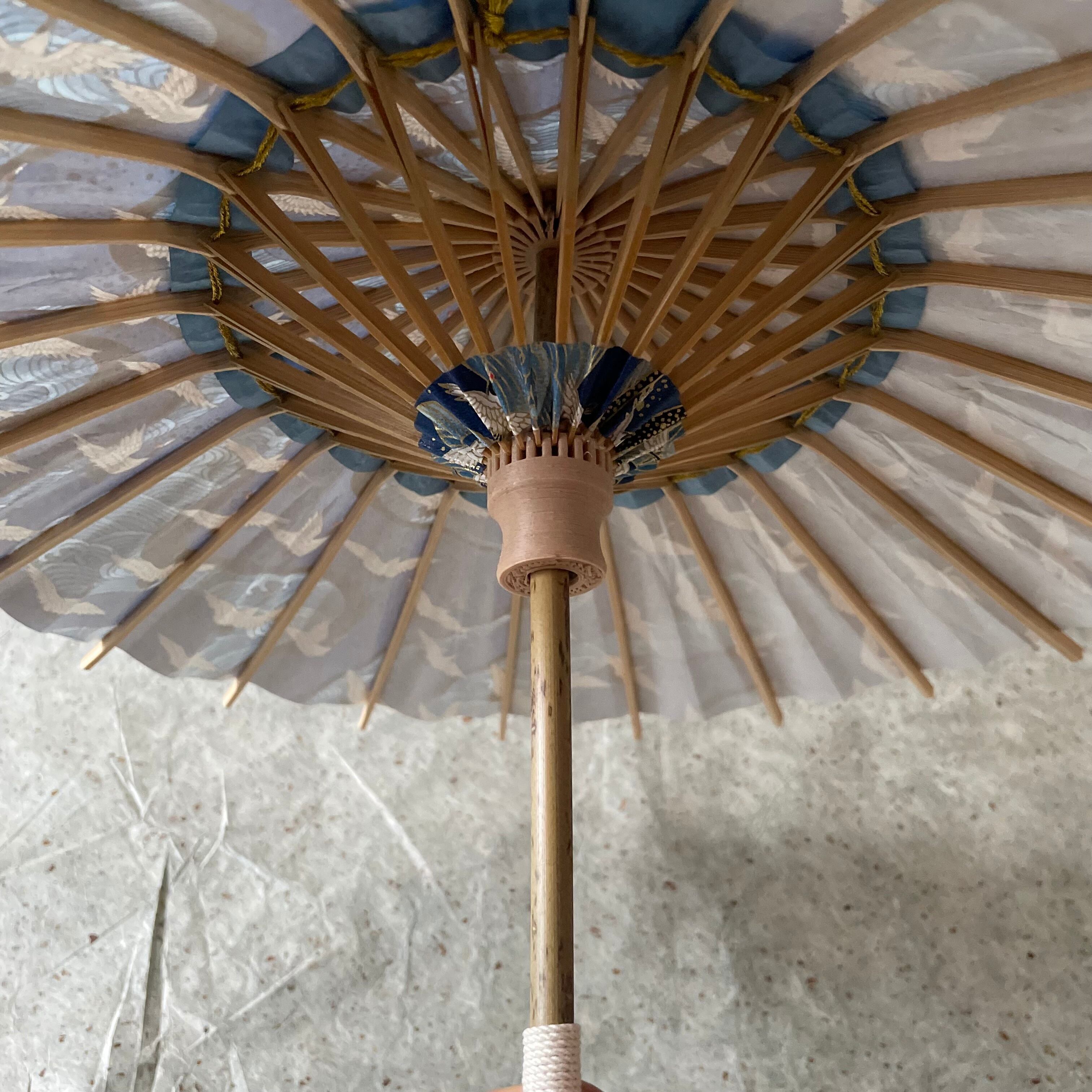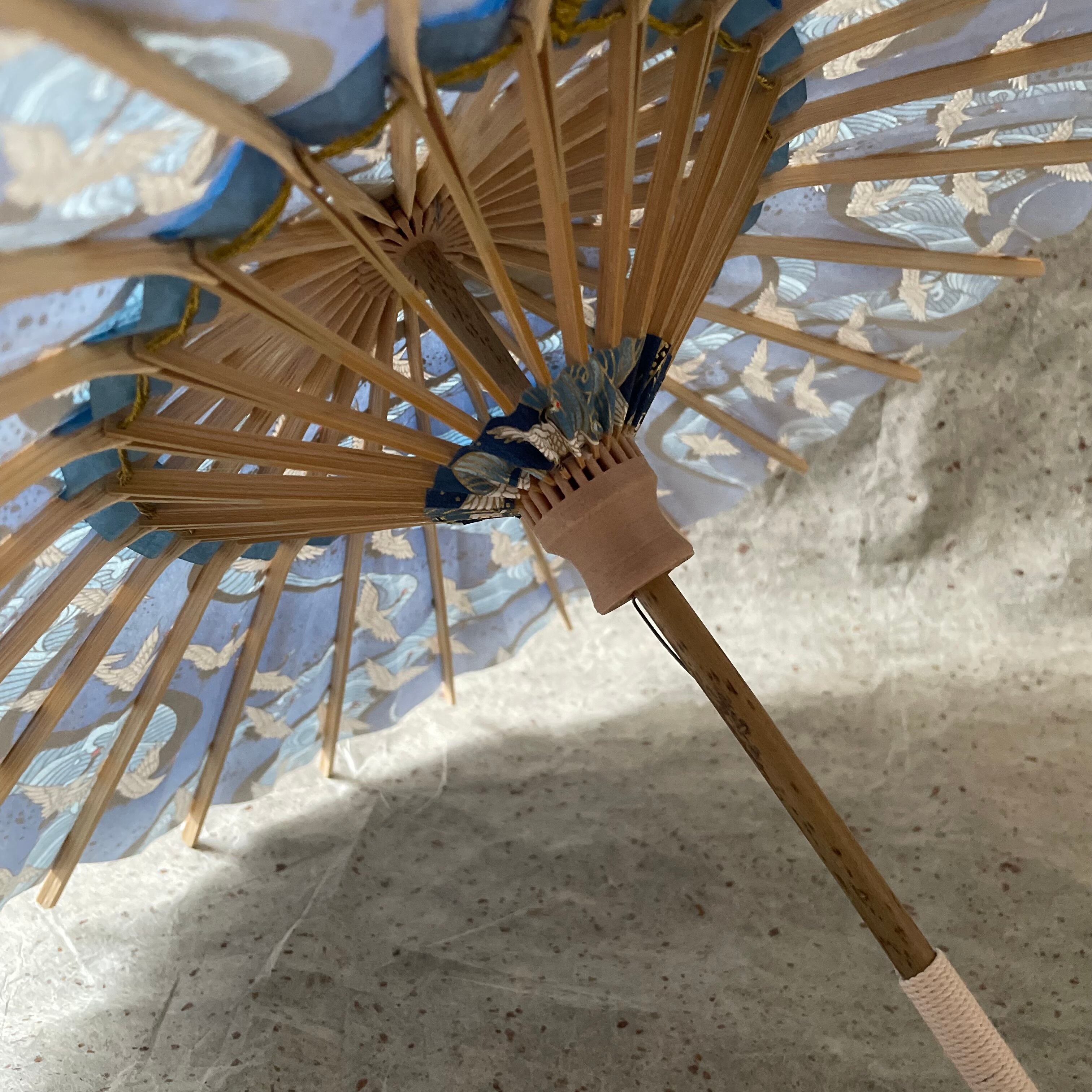 内側の「中置き紙」と呼ばれる細長い和紙を、友禅和紙の色に合わせて染めています。傘骨同士を金糸で繋いでいるので、内側も華やかです。