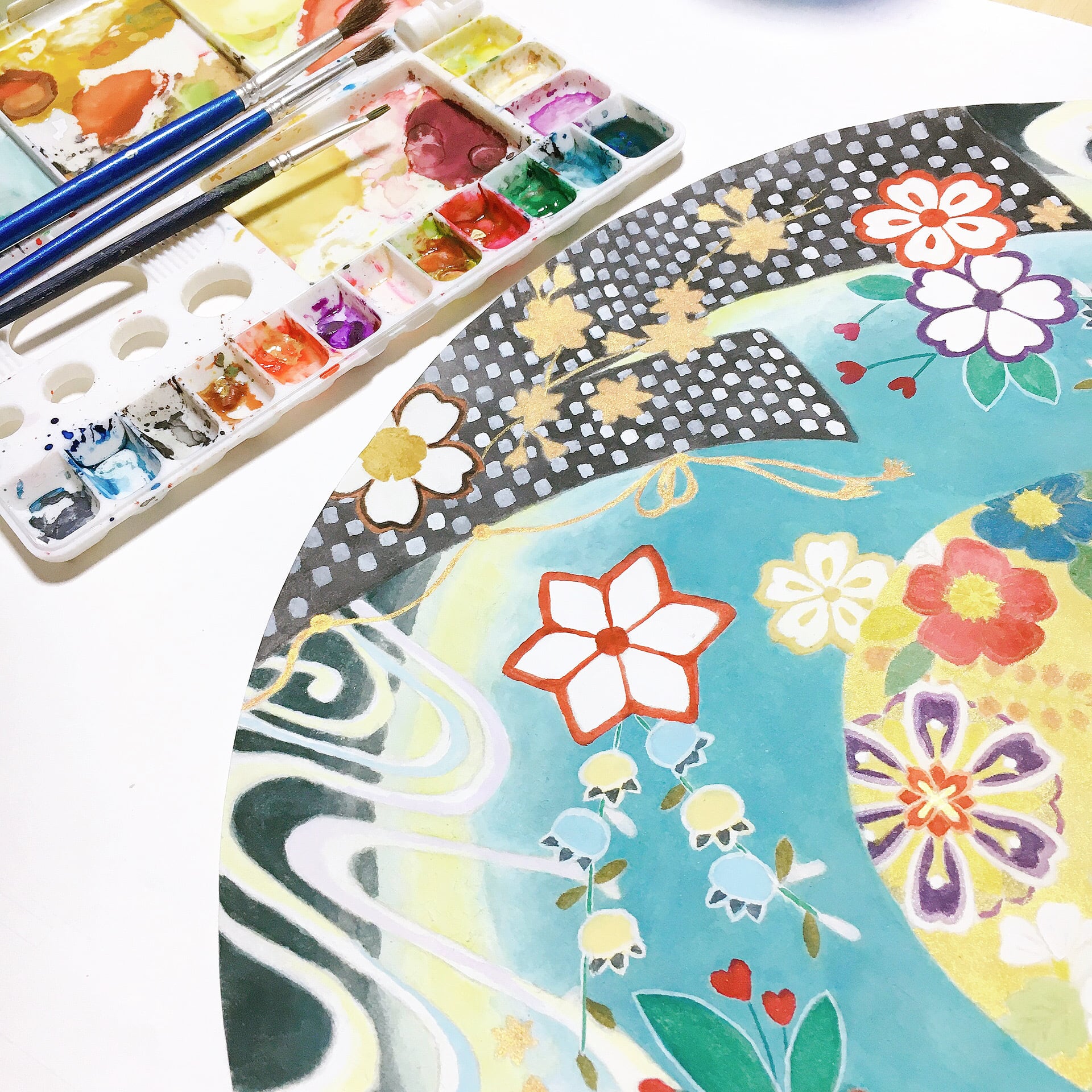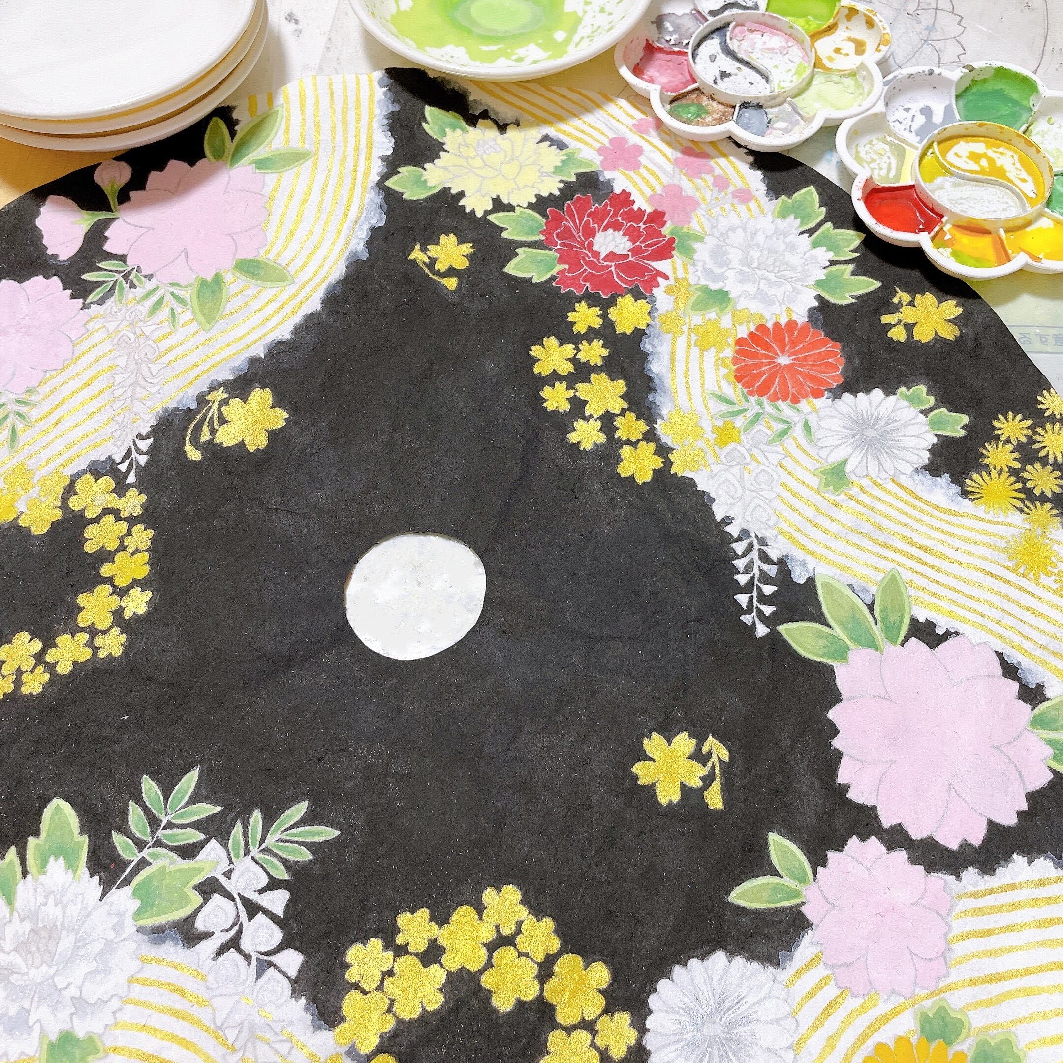 この振袖和傘のデザインは特に好評を頂いており、繰り返し絵付けしています。